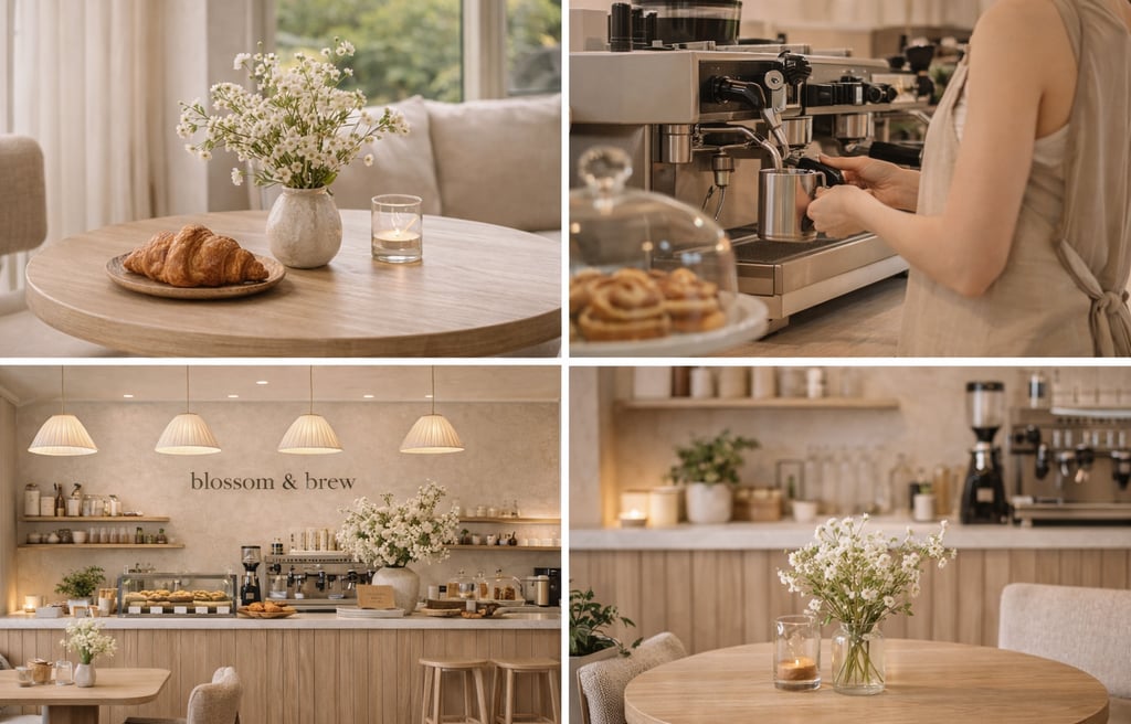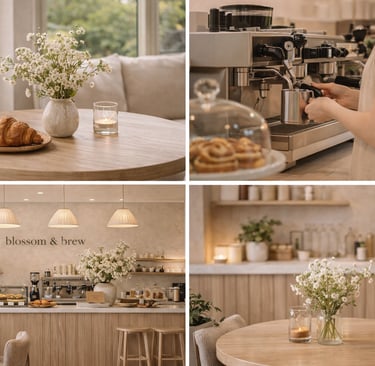 A refined café experience blending floral aesthetics with handcrafted drinks and elegant interiors.