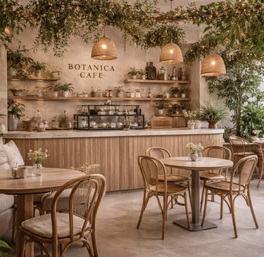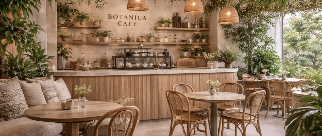 A nature-inspired café filled with greenery, organic textures, and a calming, botanical atmosphere.